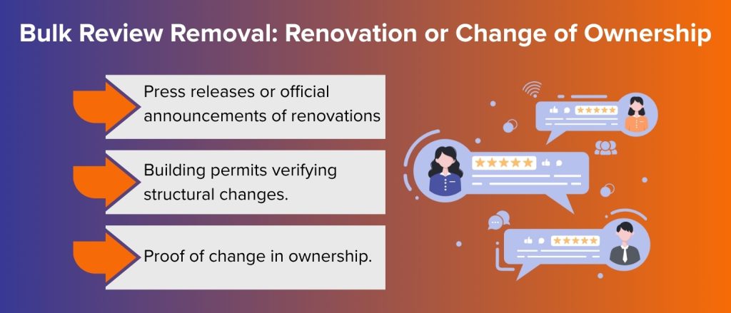 If your property has undergone a major renovation or change of ownership, you may request removal of all past reviews. Acceptable documentation includes: